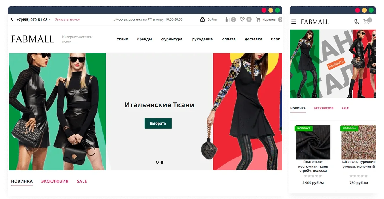 Сайт создан на лицензии Бизнес, что позволило настроить продажу не только рулонной ткани, но и реализовывать ткань на отрез любого метража.