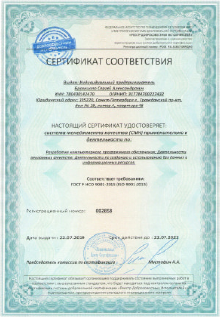 В 2019 мы подтвердили стандарты по управлению качеством: мы аттестованы по ISO 9001:2015 и имеем сертификат о включении в «Реестр добросовестных исполнителей».